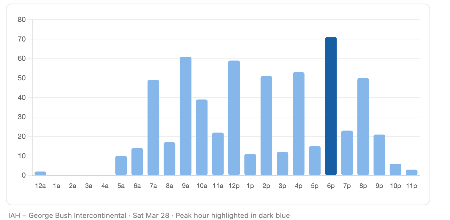 And I created this page that shows you the departure banks, so you get an idea of the times that the airports are busiest in terms of flights. This will give you an idea of what’s going on as you hear people say it took me 10 minutes but others say it took them 3 hours. And it’s because of the time they got to the airport. Let me know if this helps. I’ve only done three airports as a test. The page is at https://www.passrider.com/airport-departures-by-hour/.